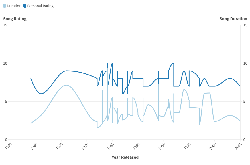 In the last graph, I compared the duration of the song, the year it was released, and my personal rating. It looks a little similar to the first graph, seeing the year and rating being compared. However, the addition of song duration makes it a little more interesting. When taking a first look, it does sort of appear that there is a pattern of some kind. Taking a closer look though, we can see there honestly isn't much of a correlation. I like songs of varying lengths, as short as one minute and as long as nine. Therefore, the conclusion that can be reached from this graph is that there is no connection between the length of a song and how much I like it.